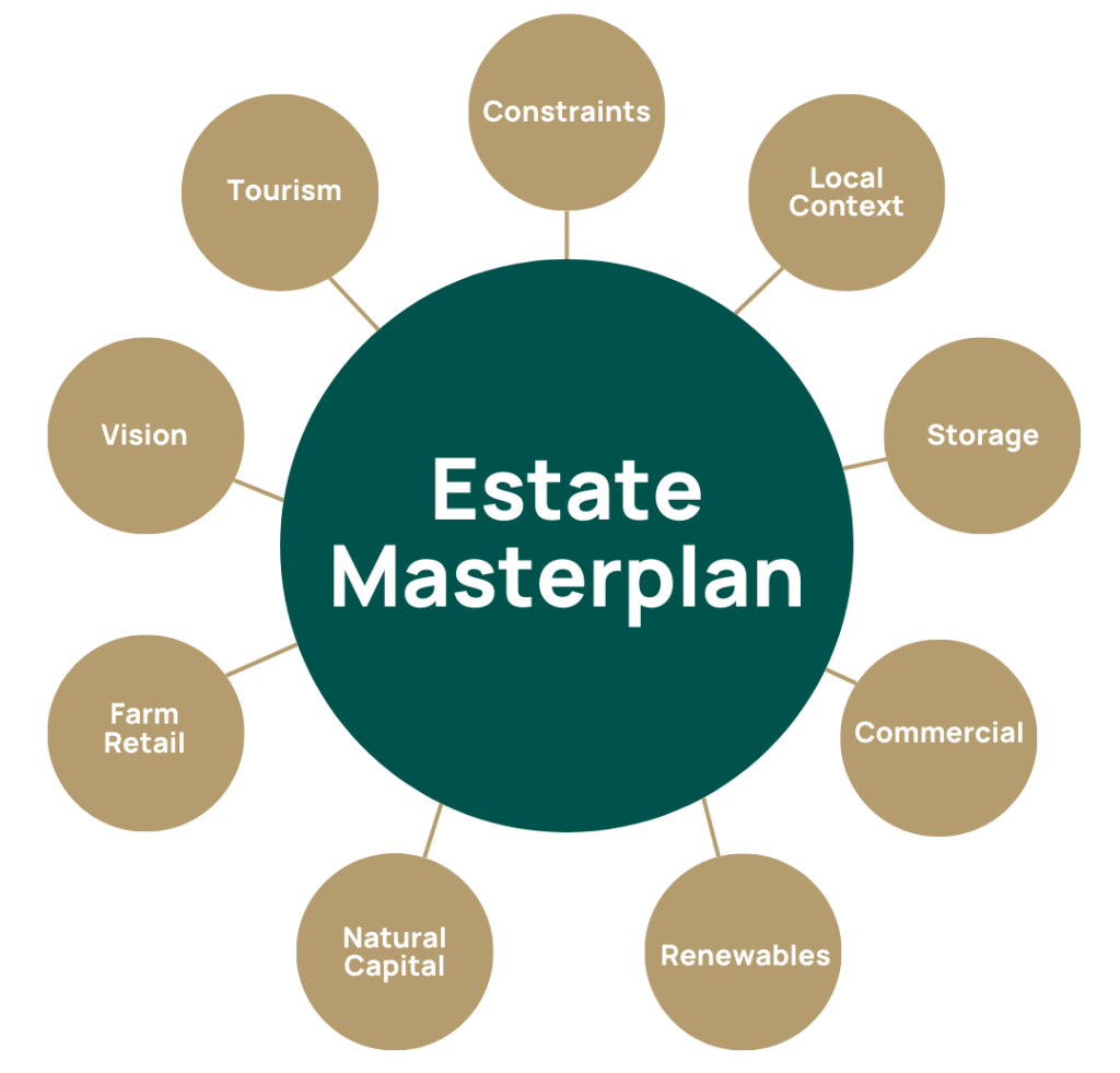 - Start with an estate masterplan that aligns your objectives and challenges with opportunities, whilst considering constraints, existing operations, succession, planning policy, local context, markets, demographics, mobility and so on